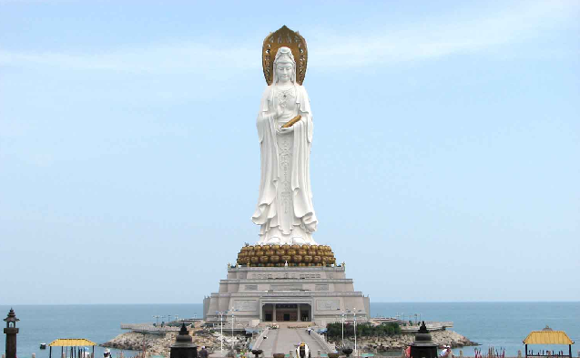 三亞南山海上觀音圣像敬造工程因其規(guī)模宏偉、意義殊勝、佛理底蘊豐富,被譽為“世界級、世紀(jì)級”的佛事工程。像體為正觀音的一體化三尊造型,寶相莊嚴(yán),腳踏一百零八瓣蓮花寶座,蓮花座下為金剛臺,金剛臺內(nèi)是面積達(dá)15000平方米的圓通寶殿。金剛洲由長280米的普濟橋與陸岸相連,并與面積達(dá)60000平方米的觀音廣場及廣場兩側(cè)主題公園,共同組成占地面積近30萬平方米的“觀音凈苑”景區(qū)。
