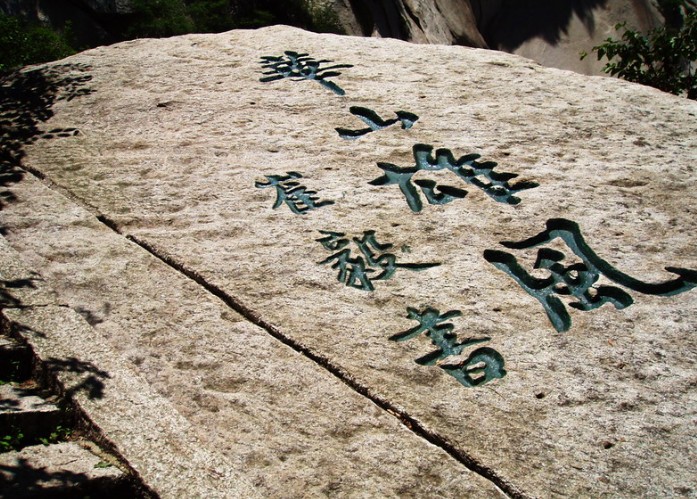 繞九天宮,履清心橋,南側(cè)崖壁上鐫有一大片文字,模糊不清,難以辨認,因此得名。來歷有三種,一是記述趙匡胤與陳摶老祖賭棋輸華山,道士們刻完后,覺得有損大宋天子的尊顏,便將刻字砸毀,使其變得模糊;二是記述“回心石”的由來,因風雨剝蝕造成模糊。三是丹經(jīng)殘文,丹經(jīng)是道家煉丹的經(jīng)文。三種說法相提并論,更加增加了模糊石刻的模糊程度。
