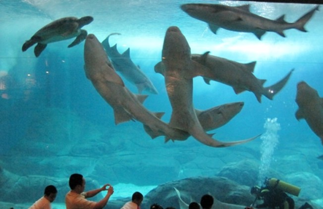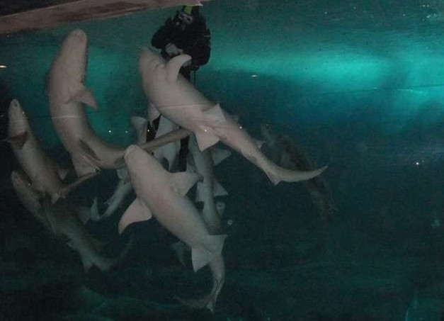 當您步進900立方米水體的鯊魚館,看到各種各樣的鯊魚,當然最驚險刺激的,還是潛水員在鯊魚池里給鯊魚喂食,聞到魚腥味的鯊魚圍著潛水員轉(zhuǎn)來轉(zhuǎn)去,爭搶潛水員帶來的小魚。