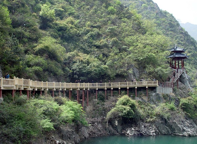 水云澗棧道長(zhǎng)400多米,猶如一條長(zhǎng)龍盤繞在峽谷之中。踱步棧道,頭頂白云飄動(dòng),身旁鳥鳴蝶舞、野花飄香,腳下水澗魚躍,叮咚歡暢!游客仿佛云中漫步,煙霧縈繞,飄飄欲仙,不經(jīng)意間峰回路轉(zhuǎn),整個(gè)身心早已融入大自然的懷抱。