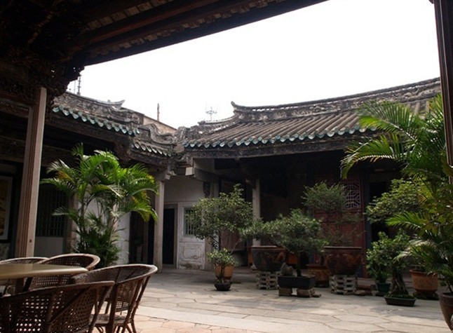 走過(guò)門(mén)樓,進(jìn)入前廳,過(guò)前進(jìn)屏門(mén),可見(jiàn)到祠堂中央的天井,天井種有花草,一派春色盎然的景色,另有一番情趣。潮汕建筑的天井,一般不大,講究精巧和儒雅,通常擺有花盆、蓮缸,種上花草,養(yǎng)有金魚(yú),營(yíng)造一個(gè)優(yōu)雅、恬靜環(huán)境。在這種環(huán)境的潮人,他們按部就班地斟酌品味工夫茶和從容不迫地彈流水行云般的潮州弦詩(shī),陶冶儒雅的民性,保持著那種講究精致的心理,這里也不例外。