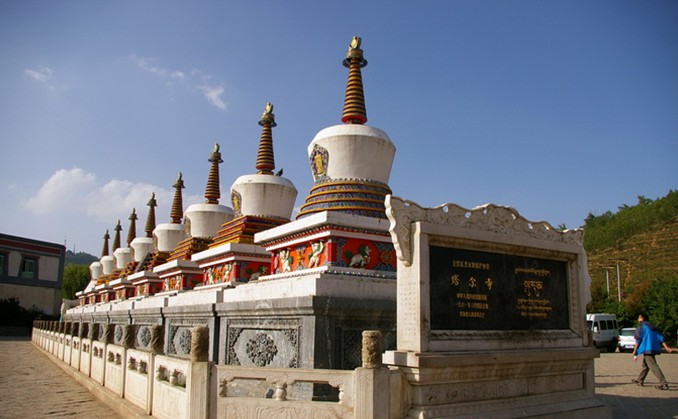 大拉浪由經(jīng)堂、華門、牌坊3座殿堂組成,為漢藏合璧式建筑,是塔爾寺總法臺(tái)的居住處,達(dá)賴、班禪曾駐蹕于此。居巴扎倉(密宗學(xué)院)系藏式平頂建筑。曼巴扎倉、丁科扎倉屬漢藏結(jié)合建筑。寶塔數(shù)十座,其中并列于寺前的8座如意寶塔,方座,瓶形塔身,尖頂,根據(jù)釋迦牟尼一生重要經(jīng)歷和傳說建成。 最后終于有了塔爾寺。