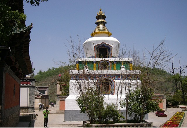 八寶如意塔,位于寺前廣場。據(jù)說,這八個(gè)塔是為紀(jì)念佛祖釋迦牟尼一生之中的八大功德而建造的,建于1776年。其造型大同小異,塔身高6.4米,塔底周長9.4米,底座面積5.7平方米。塔身白灰抹面,底座青磚砌成,腰部裝飾有經(jīng)文,每個(gè)塔身南面還有一個(gè)佛龕,里面藏有梵文。
