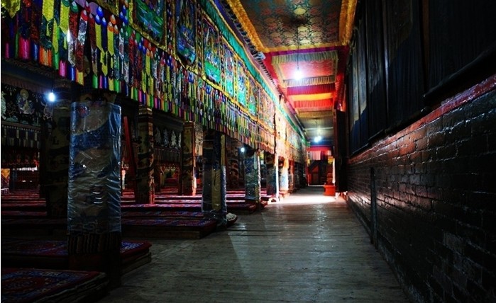 大經(jīng)堂始建于明萬歷三十四年(1606),毀于火,1917年重建。土木結(jié)構(gòu),為藏式雙層平頂建筑,漢式樓閣遙相互映。經(jīng)堂面闊十三間,進(jìn)深十一間。面積1981平方米。堂內(nèi)四壁存放著數(shù)百冊經(jīng)卷。