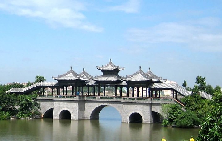 粵暉園歸水橋位于無香湖與映月湖交接的堤岸上,下設(shè)水閘,勢納東江,隨東江潮汐而變,換凈園水,永葆園內(nèi)水質(zhì)長清,故稱歸水橋。有詩為證:“橋自東江歸碧水,園從正道入青蚨”。歸水橋獨具嶺南特色,形象豐富。橋上架五亭如梅花布置,橋身用青石砌成,下由十二個大小不同的橋墩組成十五孔,平面呈“工”字形,兩側(cè)加階梯,橋面上矗立琉璃攢尖方亭五座,正中的主亭為重檐,其四角為單檐。每逢月滿,從正側(cè)橋孔觀望,每洞各映一月,金色晃動,眾月襯橋,使湖景更為美麗。歸水橋也是接通繞翠廊的關(guān)口,橋面相對前園高出3米多,這樣即使無香湖四周景觀高低起伏,又使繞翠廊有層次感,高低疊立,倚橋亭遠眺,視野開闊,園內(nèi)美景盡收眼底。正是“水應園生,園因水活”。