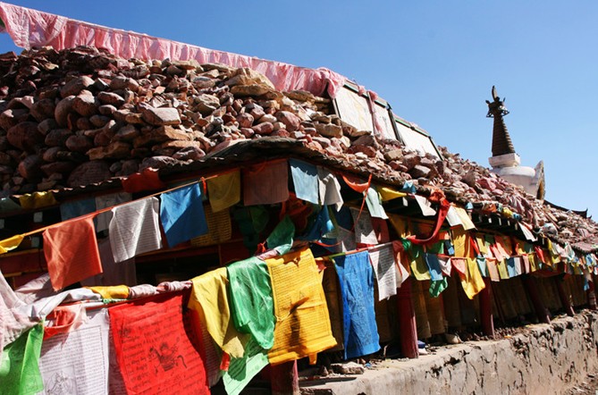 在青海省玉樹藏族自治州政府所在地結(jié)古鎮(zhèn),乘上3路公交車,大約20分鐘就到了新寨村,這里有世界上最大的瑪尼堆——新寨瑪尼城。新寨瑪尼城建于公元1715年,奠基人為第一世加納活佛宗求帕文,所以也稱為“加納瑪尼堆”?,斈岫言诓卣Z中稱“多崩”,意為“十萬經(jīng)石”的意思。占地有兩個足球場大小的新寨瑪尼城,版權(quán)所有山東聊城聊之旅國際旅行社有限公司,轉(zhuǎn)載必究!南部是新寨寺,其他各個方向均用瑪尼石堆砌成墻,在高高的圍墻高處還布滿了隨風飄舞的經(jīng)幡。