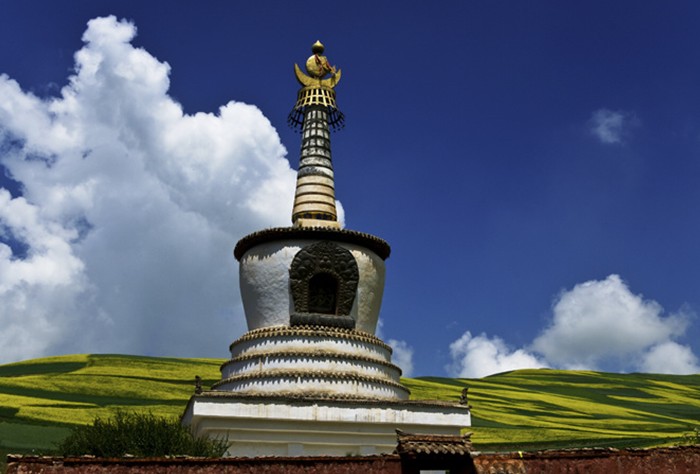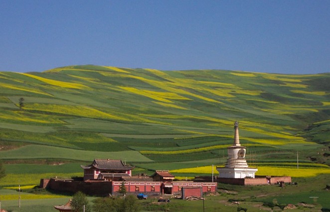 佑寧寺的建筑風(fēng)格融合了土族、藏族、蒙古族和漢族的藝術(shù),寺中的雕塑與繪畫藝術(shù)的價值很高。再加上學(xué)風(fēng)濃厚,三世章嘉•若貝多杰活佛,三世土觀•羅桑吉尼瑪活佛,三世松巴•益希班覺活佛都是著名的學(xué)者,可謂名僧輩出。了解了佑寧寺的滄桑歷史之后,就讓筆者帶座深山古寺去一探究竟吧。經(jīng)過數(shù)十公里崎嶇山路的顛跛,想必性急的您—定已經(jīng)有種急于朝拜圣地的沖動了吧。依山傍水的佑寧寺雖然經(jīng)歷了戰(zhàn)火的無情摧殘,但數(shù)百年的歲月已經(jīng)把當(dāng)年的硝煙沖刷得一干二凈,寺院與山體層疊交錯,渾然一體。寺前的白塔在山間嫩黃的油菜花的襯托下顯得無比雄武,古樹、佛殿交相呼應(yīng),更顯寺院的威武莊嚴(yán)。這里最佳的旅游季下是每年的農(nóng)歷正月、四月、六月及臘月。版權(quán)所有山東聊城聊之旅國際旅行社有限公司,轉(zhuǎn)載必究!因為屆時寺院將舉行較大規(guī)模的法會,熱鬧非凡。由于身處土族聚居的互助縣,這里的僧侶幾乎全部是土族,對于篤信喇嘛教的土族來說,到寺院”經(jīng)聽法是新年里一等一的大事。每年的正月初二,寺山將舉行為期十五天的祈愿法會。
