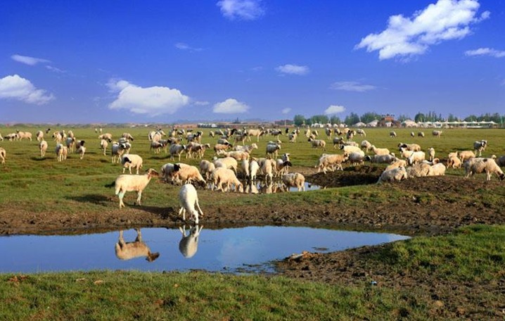 由駱駝山向南,進入通湖草原。這里群沙環(huán)抱,綠草如茵,平湖如鏡,藍天白云之下,牧村、敖包、群群牛羊點綴其間,妙趣天成,如一塊碧玉鑲嵌在浩瀚沙海之中。