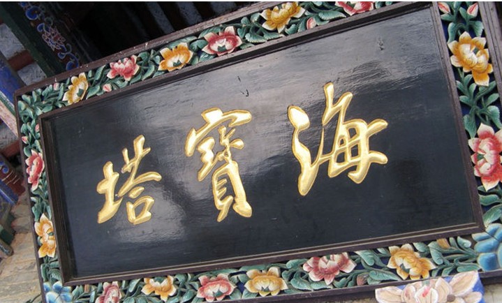 高聳在大佛殿和韋馱殿之中的海寶塔,是寺內(nèi)的主體建筑,又名“黑寶塔”,俗稱“北塔”。這是一座方形九層十一級樓閣式磚塔,通高 53.9米。塔建在一處方形寬闊的臺基地上,臺高5.7米,邊長19.7米。臺上四周有青磚砌花墻,東面正中有石階可以登臨塔座門。塔身平面呈方形,四壁出軒,每層四面設(shè)券門,均向外略有突出,構(gòu)成鮮明的十二角形。塔身內(nèi)為上下相通的方形空間,各層之間以木板相隔,沿木梯可登至頂層。塔身四面轉(zhuǎn)角處均懸有風鈴,風吹鈴響,更覺寧靜悠揚。塔上端為磚砌四角攢尖頂,頂上置方體桃形綠色琉璃塔剎。海寶塔建筑風格獨特,方形的塔身,四面的券門,眾多的棱角,四角的尖頂,為中國古塔所罕見,被視為中國古代建筑的杰作。