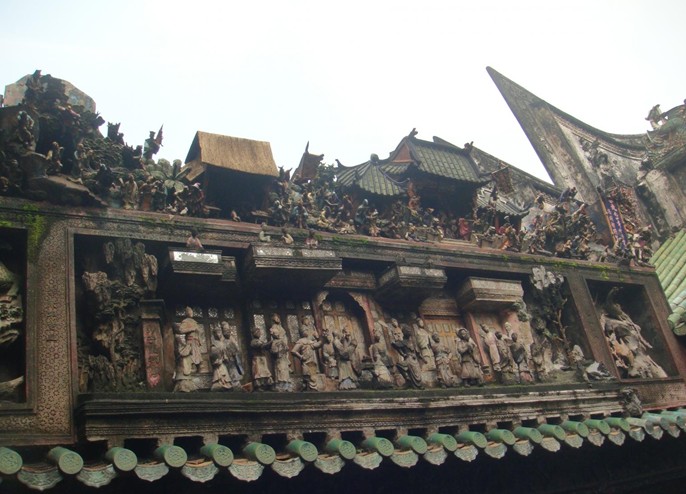 祖廟由三座廟宇并列而成,武當(dāng)廟(也稱北帝廟)作為主體廟居中,左為普陀廟(也稱觀音廟),右為文昌廟(也稱文昌閣),三廟分別供奉著北方真武玄天上帝、觀世音菩薩、文昌帝君的神像。三廟的建筑均為二進(jìn)院落式布局,采用磚木結(jié)構(gòu)。墻體全是水磨青磚對(duì)縫砌就,屋面為碧綠色的琉璃瓦,出檐施以木雕蓮花托,四角翹飛,屋脊上鑲有雙龍戲珠及瓷制人物,栩栩如生,"藝術(shù)裙"上刻有歷史典故、神話傳說、人物花卉、詩書字畫。祖廟現(xiàn)存的磚雕、陶塑、石刻、灰塑等,以其工藝精湛、造型獨(dú)特、色彩斑斕,展現(xiàn)出祖輩們的聰明才智和濃厚的民族特色,使這座古老的廟宇真正成為巧奪天工的藝術(shù)殿堂,讓人賞心悅目,流連忘返。