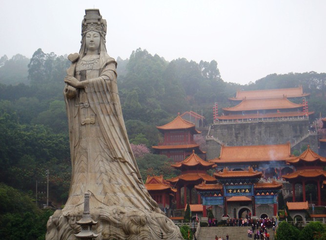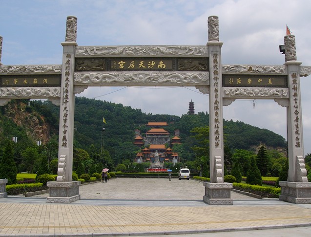 南沙天后宮,緊臨珠江出海口伶仃洋,坐落于大角山東南麓,依山傍水,其建筑依山勢(shì)層疊而上,殿宇輝煌,樓閣雄偉,在天后廣場(chǎng)正中就是石雕天后圣像,是為紀(jì)念海上女神林默而建,建筑特點(diǎn)是集北京故宮的風(fēng)格和南京中山陵的氣勢(shì)于一體,其規(guī)模是現(xiàn)今世界同類建筑之最,被譽(yù)為“天下天后第一宮”,也是東南亞最大的媽祖廟。天后圣像高達(dá)14.5 米,屹立在天后宮廣場(chǎng)正中。