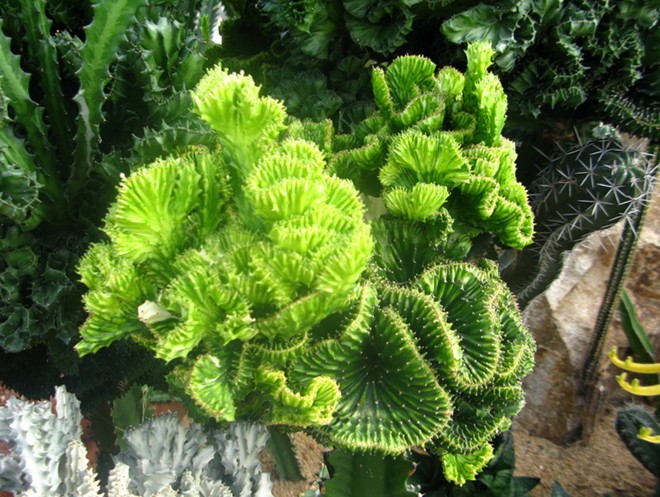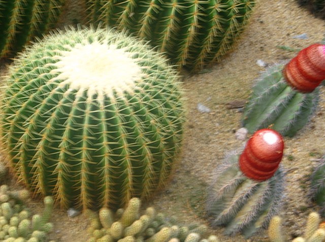 玻璃房為門式鋼架結(jié)構(gòu),跨度分別為10m與8m,高分別為7.4m與7m。甲號玻璃房保留了原有知名的神秘果、墨西哥油梨、夷蘭香、金蓮木、咖啡等熱帶植物,片植鳳梨科植物,營造熱帶植物成林,小道藏于林間、迂回曲折,植物種類豐富,生長茂盛,行于其中數(shù)尺之外可聞其聲不見其人,如同進入南美熱帶森林。乙號玻璃房調(diào)整了景觀格局,遍地砂礫,行人穿梭沙丘曲行而過,以地生、氣生、附生鳳梨植物配以園林小品替換原有肉質(zhì)植物,使人宛若置身于沙漠之中。