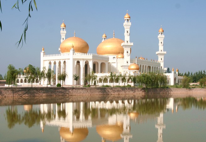 中華回鄉(xiāng)文化園主體大門是借鑒印度泰姬陵設(shè)計建造的。她高38米,長206米,即便是站在很遠的地方也能夠看得到她的身影。站在她的面前,她的高大、偉岸、恢宏,給你以視覺的沖擊。走近她,她潔白的身軀、飽滿的穹頂、絢麗的浮雕、繽紛的彩繪、精巧的結(jié)構(gòu),在藍天白云的映襯下,給你的是心靈的震撼。來到這里,你會被她濃郁的伊斯蘭風格所吸引、所感染、所陶醉;你會明白什么是圣潔的天堂;你還會深深的感受到,來到這里心靈即將經(jīng)受一次伊斯蘭文化的洗禮。這是建園人的夢想,也是所要達到的目的,更是中華回鄉(xiāng)文化園所要突出的主題。