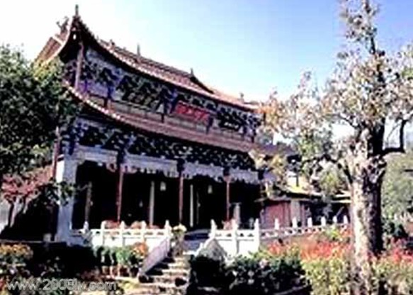 正殿的柱子,都是一人圍抱,正中央的一對(duì)柱子上,各有一條栩栩如生的蛟龍,沿柱環(huán)繞,龍尾幾乎接近地面,舞牙張口的龍頭,象要騰云駕霧,將及柱頂大梁。殿中供奉著白族信奉的“最高本主”,年年每到四月,正當(dāng)春暖花開的時(shí)候,附近州縣的群眾,長途跋涉前來祭祀。雪泉水,環(huán)寺突涌,游人到此,都以能暢飲 .