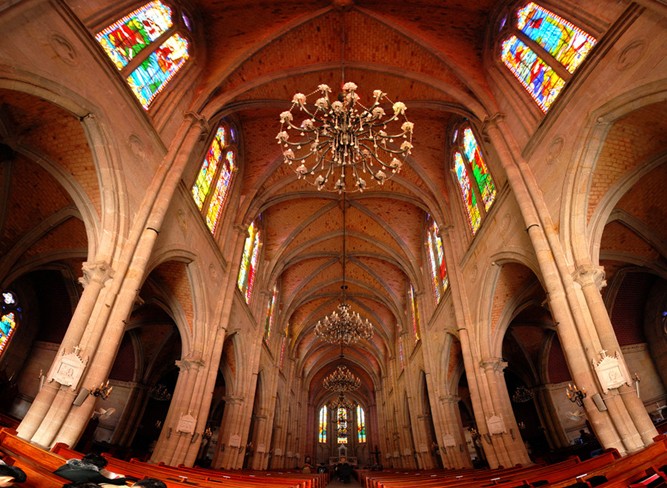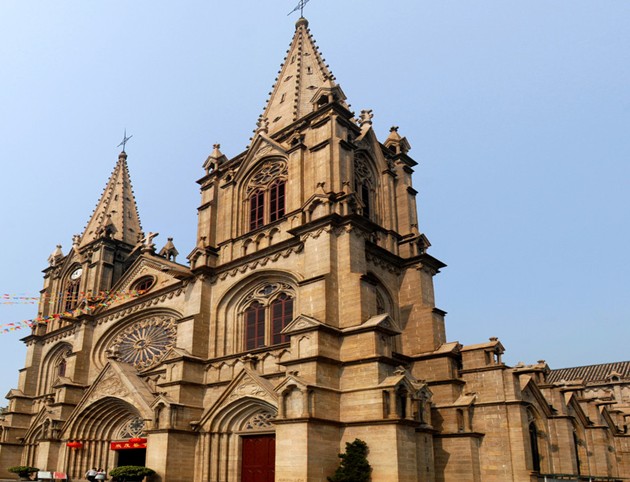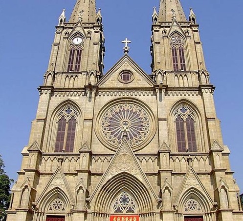 該教堂正面是一對高聳的尖頂石塔,象征升向天堂,皈依天主;石塔中間西側(cè)是一座大時鐘,石塔中間東側(cè)是一座大鐘樓,裝有四具從法國運(yùn)來的大銅鐘;西邊鐘樓的西、南、北三個塔面安裝有羅馬字鐘面的時鐘,東邊鐘樓內(nèi)懸掛著以圣母瑪利亞命名的銅鐘組;正立面的鐘樓上聳立尖塔,是哥特式教堂建筑風(fēng)格的特征,也是建筑造型藝術(shù)魅力的內(nèi)是尖形肋骨高叉的拱形穹窿;正面大門上面和四周墻壁分布的花窗欞,都是合掌式,所有門窗都以法國制造的較深的紅、黃、藍(lán)、綠等七彩玻璃鑲嵌。這玻璃可避免室外強(qiáng)光射入,使室內(nèi)光線終年保持著柔和,形成慈祥、肅穆的宗教氣氛。充分展現(xiàn):尖塔為空心的八角形錐體,用石塊砌成,其下是三層樓房,尖塔越往上越陡峭,最后像錐尖刺向蒼穹。