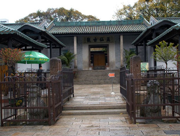 五仙觀位于惠福西路?,F(xiàn)寺觀建于明洪武七年(1337年),是一座祭祖五仙的谷神廟。該觀屬道教寺廟,寺坐向南,門上大匾上有清人書寫的“五仙大觀”四個大字。五仙觀依山而建,現(xiàn)存有頭門、后殿、東齋與西齋。五仙觀為綠琉璃瓦重檐歇山頂,木構(gòu)架保存完好,玲瓏新巧。后殿東側(cè)裸露的一塊紅砂巖,上有巨大的腳印凹穴,古人一向認(rèn)為這是“仙人拇跡”,重點保護下來。明清兩代,這里分別以“穗石洞天”和“五仙霞洞”列入羊城八景。
