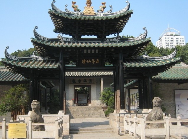 “五仙觀”解放前在惠福西路內(nèi)街,是廣州建城2000年的歷史標(biāo)志,傳說遠(yuǎn)古年代有五仙人騎著五色羊,五羊銜著谷穗降臨廣州海珠廣場原五仙門電廠附近(電廠原址是五仙街)。五仙喜降臨,令廣州風(fēng)調(diào)雨順,五谷豐登,國泰民安。為紀(jì)念五仙福祉,稱廣州為“羊城”。