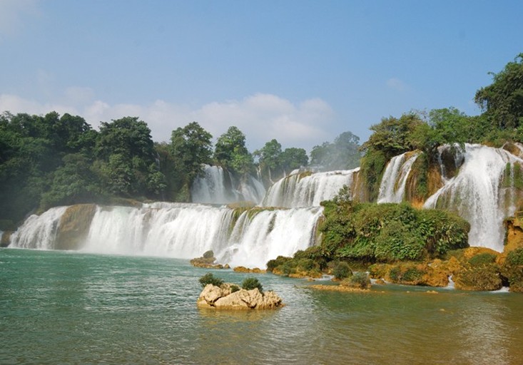這里一年四季景色各異,雄奇瑰麗,變幻多姿,碧水長流,永不涸歇。春日,紅棉怒放,燦若云霞;夏臨,青峰浴水,花木繁茂;秋至,金風送爽,遍地金黃;冬來,群峰峭拔,山色空濛。無論陰晴云霧,季節(jié)交替,總是各具情態(tài)。五百里畫廊更是一路展開一幅又一幅寧靜抒情的南國風情畫卷。山巒從翠,奇峰錯列,輕紗繚繞,霞落云飛,山影平湖,茂林翠竹,花草掩映,百鳥低徊,綠水梯田,民居水車,小橋流水,耕夫荷鋤,村童在小河中嬉水,竹筏在秀水中穿行……這些如畫美景又豈是簡言陋語能描述、丹青妙手所能繪的呢?來吧,來德天,讓我們拋開一切煩囂,融入這大自然的懷抱!