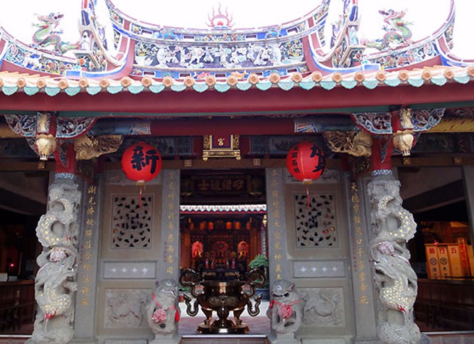 進入山門,正對著的是三元宮的主殿(正殿)三元殿,這是全宮布局的中心。殿面闊五間20.07米,進深五間16.85米。布瓦歇山頂,綠琉璃瓦剪邊,梁架為穿斗式與抬梁式混合。殿前拜廊為卷棚頂,拜廊兩邊為兩層的鐘鼓樓。該樓層較矮,卷棚與拜廊連成一體,并跟三元殿前檐相接,與山門連在一起,成為整座建筑物的核心,風(fēng)格十分獨特。這在廣州古建筑中是獨一無二的。