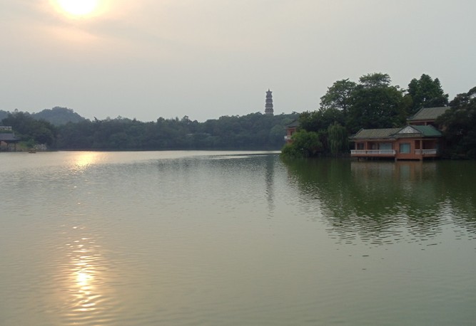 惠州西湖幽深曲折,淡雅秀邃,水明如練,山曲若環(huán);春風(fēng)逸蕩,夏景流芳,秋艷洲渚,冬林染翠,四時之景各有其妙。日出聽天籟齊鳴,日暮觀雁塔斜暉;麗日晴和則萬象開朗,霧雨迷蒙則冷煙濕翠;風(fēng)颯颯而飄襟,露零零而浸膚,人游于湖上,月圓于水天,可謂一步一景,步移景變,景色萬千。