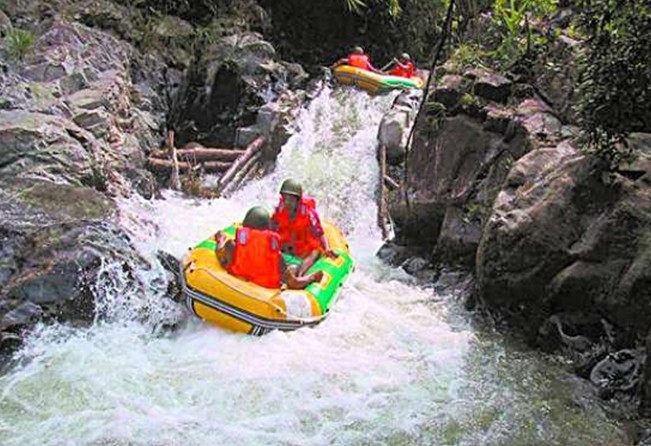 油田礦泉漂流最大的賣點,是其中的高臺沖水之漂,據(jù)聞屬于首創(chuàng)。漂流水道落差變化莫測,漂流者的橡皮筏在急流中時沉?xí)r浮,從3米高的水道中飛奔而下,人和筏子沖到水底去了,瞬間又浮現(xiàn)了上來,時而蜿蜒于峽谷叢林,或漂浮于天光云影之間。