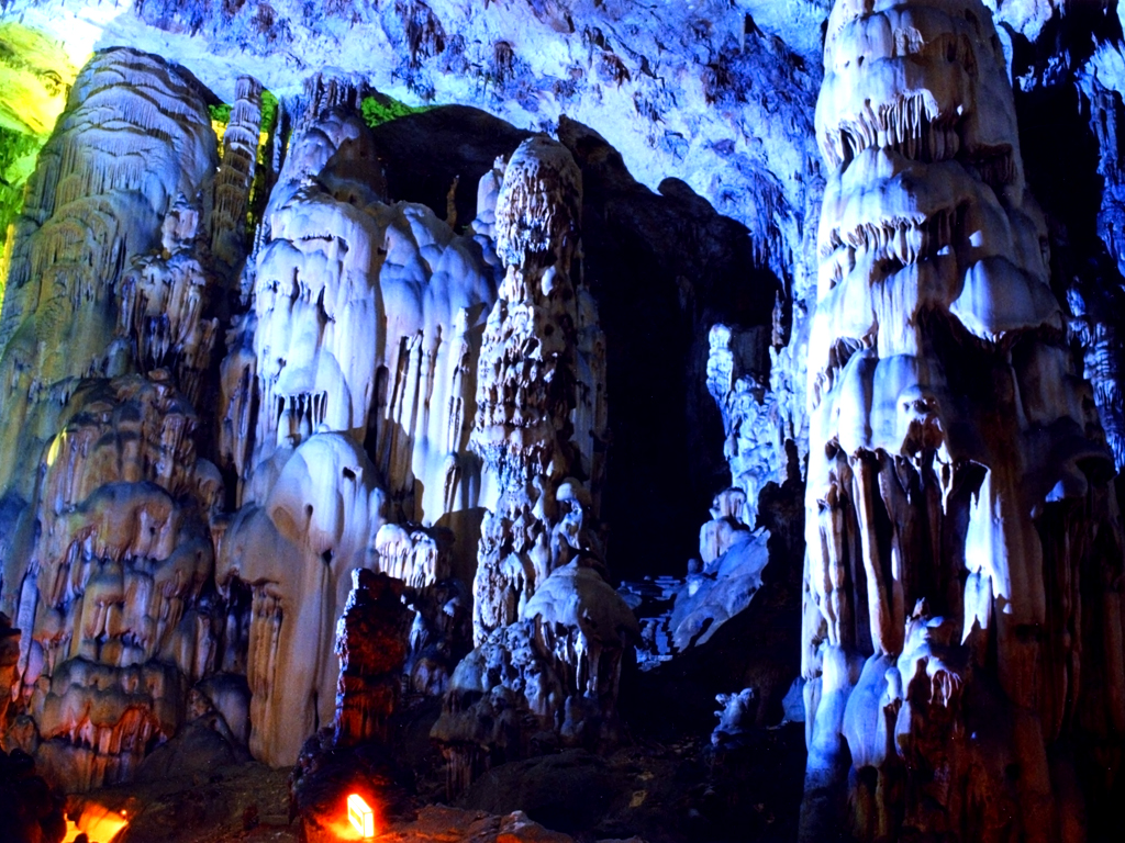 你也會聯(lián)想到一首樂曲、一首凝固的樂曲,錯綜的巨大洞口一開始就定下了這首樂曲神秘磅礴的基調(diào),然后變幻為狹窄的幽徑如婉轉的小調(diào)進入神秘的“講經(jīng)堂”和“萬壽宮”而形成強烈對比,讓你感到一種星光隱隱、海波回蕩的交響,這交響演繹成彎彎曲曲的南天門又拐入水晶宮——一段田園風光的插曲,插曲結束是如歌的行板———明朗而華美絢麗的靈霄殿,之后是樂曲的高潮——廣寒宮,神秘深邃的主旋律重復再現(xiàn)直至“銀雨樹”而嘎然中止。不同閱歷的人,想象的角度和內(nèi)容也不同,還會聯(lián)想到了中國的名山大川諸如“水鄉(xiāng)澤國”、“黃土高原”,聯(lián)想到了古羅馬城堡和古希臘遺址。你甚至還會發(fā)思古之幽情,與這經(jīng)歷了數(shù)十萬年的石頭精靈溝通,渴求一種深切的生命體驗,探尋它的由來。一群年輕的地質(zhì)科學工作者,沉浸在這種探尋之中。