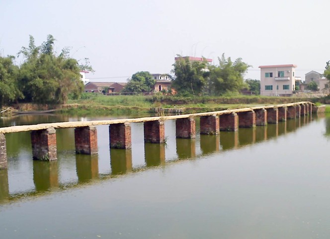沿著彎彎的鄉(xiāng)間小路,可來到古勞水鄉(xiāng)一處名叫“二渡橋”的地方。只見前面的圍墩上,有幾棵百年老榕,靜靜地鎮(zhèn)守和護衛(wèi)著這一方水土。榕蔭下,幾塊長條花崗巖石條曲曲折折地架在魚塘邊的木樁上,頗有一種“小橋流水人家”的韻味。這種花崗巖石條,當?shù)厝朔Q它“條石”或“西樵石”。因水鄉(xiāng)的泥土細滑,不易滲水,偶爾幾滴小雨,這里便遍地泥濘,行走不便。于是居民們便用這種“條石”沿著小河涌和糖基鋪路,形成了遍布水鄉(xiāng)的石板小橋和石板小路,構成一幅獨特的風景。