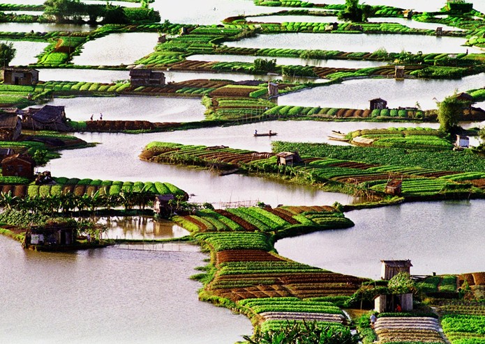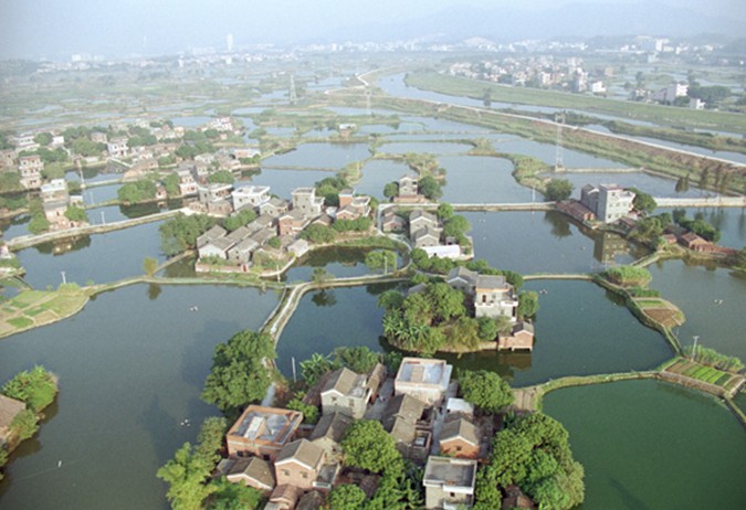 古勞堤內(nèi)水網(wǎng)縱橫交錯,小艇穿行如梭,兩岸蕉林搖曳,萬畝魚塘似明鏡耀目,千頃桑地綠海翻波,那青青的田疇就像精雕的翡翠,好一派旖旎的南國水鄉(xiāng)風光。