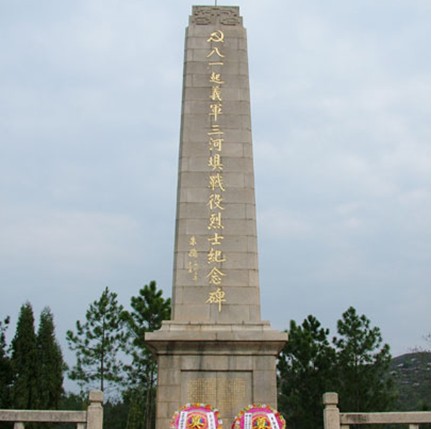 三河壩烈士紀(jì)念碑位于汀江、梅江和梅潭河三江匯合的三河壩。三河壩群峰對峙,地勢險(xiǎn)峻,是水陸交通要沖,歷來為兵家必爭之地。南昌起義軍曾在朱德的率領(lǐng)下在這里與國民黨錢大鈞部激戰(zhàn)了三晝夜,許多戰(zhàn)士犧牲在這晨。1964年當(dāng)?shù)卣谌訅螙|岸的筆枝尾山頂建造了15米高的紀(jì)念碑,后來又在左邊建了紀(jì)念亭,現(xiàn)已列為廣東省重點(diǎn)文物保護(hù)單位。