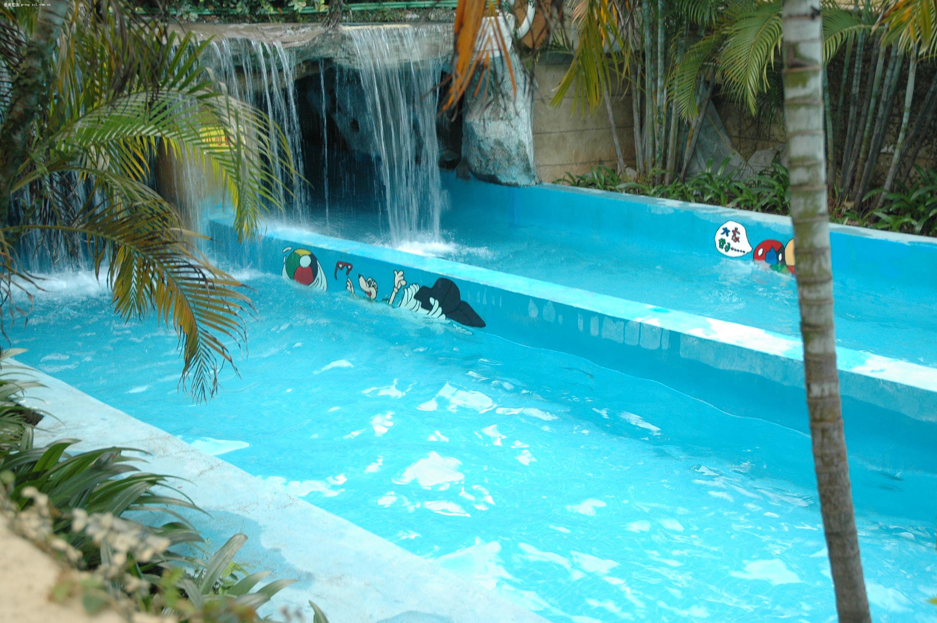 二、濃蔭蔽日、棕櫚搖曳的南國風(fēng)情使人心曠神怡。 闊別一冬的夢(mèng)幻水城已經(jīng)成為一個(gè)濃蔭蔽日、棕櫚搖曳的綠色的世界,漂流河、兒童池、滑道以及情侶池等被綠蔭所掩蓋,那些爬藤植物使所有的遮陰棚看起來象一座座涼爽的小屋,使“古老的廊堡”更添滄桑感。在一片綠色的世界下面,潔凈的水汩汩而流,水槍水炮在樹逢里噴射,這是一個(gè)真正的清涼世界。