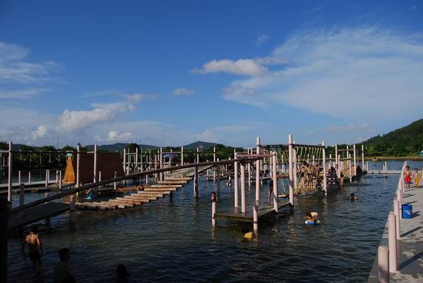 三疊泉是珠海橫琴島上的名泉,泉水自市區(qū)最高峰腦背山(458米)由上而下疊成的瀑布——大狹瀑——飛凌瀑——隱靈瀑飛流直下而得名,山澗有許多的清澈的溪泉,山腳下更有可以暢飲的山泉泳場(chǎng),它一鵝卵石砌岸鋪底、泉水自進(jìn)自去、活水泳場(chǎng)清爽暢快。并有一個(gè)1.5萬(wàn)平方米的大型沙灘泉水泳場(chǎng),泉水有兩種水溫,上暖下涼,這就是最獨(dú)特之處。海島少有清洌的甘泉,而三疊泉竟能成瀑、成潭、成泳場(chǎng)、既可觀、有可飲、可游樂(lè)、是島上一絕。