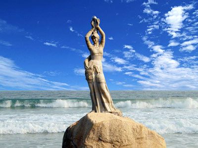 相傳,在一百多年前,這里有位商人特意請來一位風(fēng)水先生,想讓他幫忙選一塊“風(fēng)水福地”用來安葬自己的老父,祈求日后子孫后代能興旺發(fā)達(dá)。他跟著風(fēng)水先生順著山脈,沿著海邊一直“追龍”,察看地形。最后,他們來到香爐灣附近時,太陽已經(jīng)下山,一輪明月早以升起,皎潔的月光灑在黑黝黝的峰巒之上,遙看山貌,宛若一頭翹首望月的大犀牛。巧舌如簧的風(fēng)水先生馬上就說:“嗯!這座犀牛望月山就是一塊能發(fā)跡的風(fēng)水寶地”。商人一聽,非常滿意。于是,將亡父安葬至此。并且,按照風(fēng)水先生的話,爬上山頂,面向南海,靜靜地許下自己的愿望。過了兩、三年,商人果然生意興隆,財運亨通,成了富甲一方的巨賈。