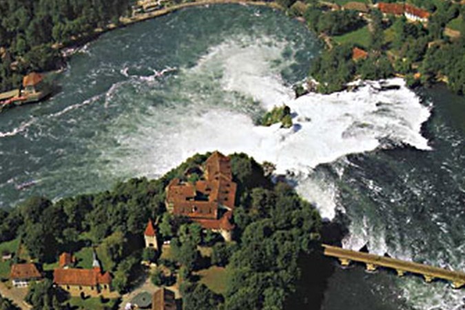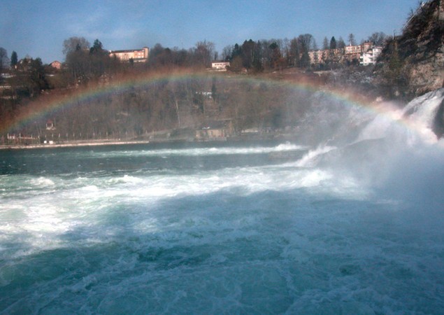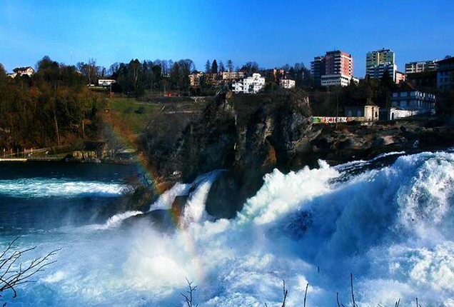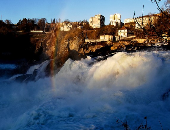 中歐最壯觀的瀑布,在瑞士北部萊茵河上游。包括一些險(xiǎn)灘在內(nèi),全部落差約30米(100呎),寬150米(492呎)。一塊柱狀巖石把瀑布分成兩個(gè)主要部分,位于河右岸的落差約15米(50呎),左岸約20米(65呎)。