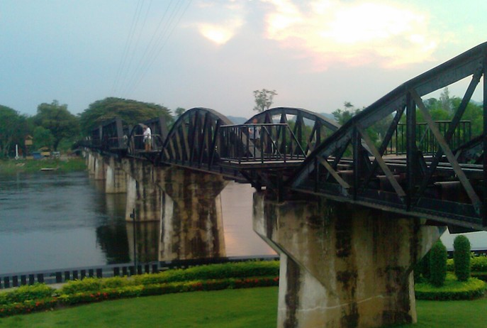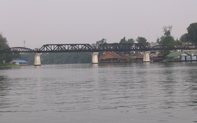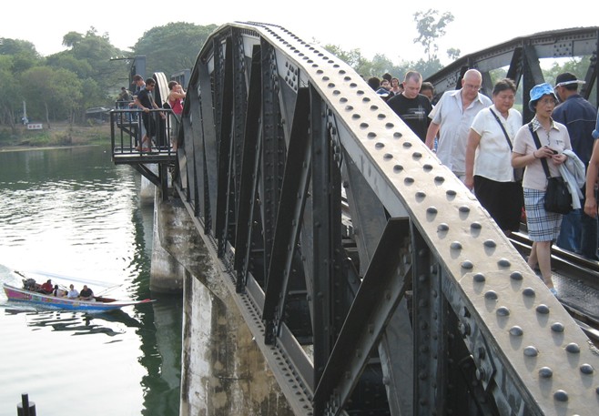 桂河大橋原為木橋,幾經(jīng)飛機(jī)轟炸,早已毀壞,只有在河水很淺時(shí)才能看到殘跡,現(xiàn)在我們看到的是后來(lái)修建的鐵橋,它今天還在通車(chē)。重建后的桂河大橋,在原來(lái)橋的兩側(cè)圓弧鐵架多出了兩段不協(xié)調(diào)的方形鐵架,沒(méi)有原先圓弧鐵架的優(yōu)美,很多看過(guò)的人覺(jué)得不倫不類(lèi)、不搭調(diào)。桂河大橋大約10分鐘就可以走完,過(guò)了橋就是一般的死亡鐵路,一直前行可以通到緬甸。站在桂河大橋的橋頭,看著夕陽(yáng)下靜靜流淌的美麗桂河,使人難以想象這里發(fā)生過(guò)的悲慘故事,只有安放在橋頭的美軍投下未爆炸的炸彈提示著我們當(dāng)年那場(chǎng)慘烈的戰(zhàn)爭(zhēng)。