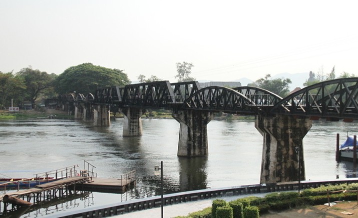 桂河大橋在曼谷西北122公里的北碧府(Kan-chanaburi),這座橫跨桂河的大橋———桂河大橋,折射了二戰(zhàn)期間的一段歷史:當(dāng)年日軍占領(lǐng)泰境期間,強(qiáng)迫盟軍戰(zhàn)俘建造鐵路連接緬甸及暹羅,這條鐵路在犧牲了無(wú)數(shù)寶貴性命后才得以完成,故有“死亡鐵路”之稱(chēng)。桂河大橋就是其中的一段,被稱(chēng)為“死亡鐵路”的咽喉。大橋的一邊地勢(shì)較為平緩,但一過(guò)河便是險(xiǎn)峻的群峰,有的路段甚至就開(kāi)鑿在懸崖絕壁之上。