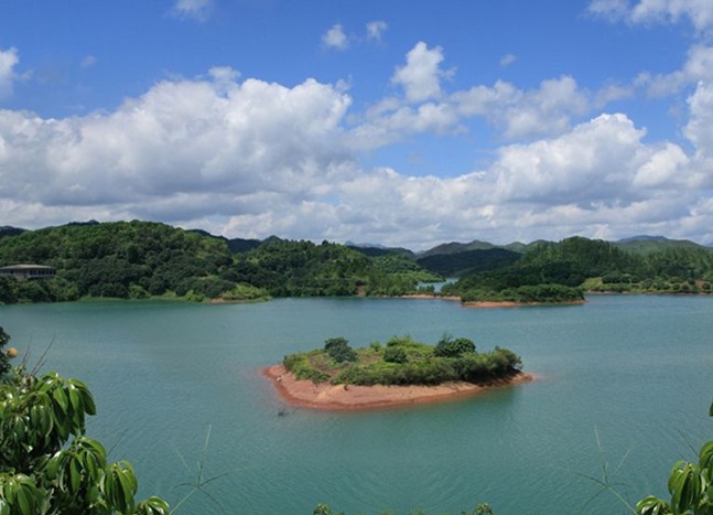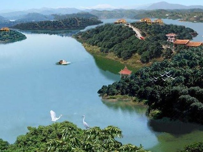 只要登上西湖豪華游艇、飛艇,作環(huán)庫游。隨著飛艇在平靜的水面上飛馳,就能看到的是大大小小三百多個(gè)庫灣,一個(gè)個(gè)浮在水面的荔枝孤島,兩邊山上,一片片翠綠茂盛的是荔枝林。