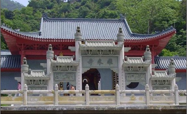該寺位于廣東清遠(yuǎn)市北江小三峽處的飛來(lái)寺,相傳是從安徽飛來(lái),故名飛來(lái)寺。相傳在梁武帝普通元年(公元520年),軒轅黃帝的兩個(gè)庶子太禺和仲陽(yáng)隱居在飛來(lái)峽。一個(gè)月明之夜,他們邊飲酒、邊作樂(lè)、邊欣賞眼前這峰巒疊嶂、江水凝碧、漁火點(diǎn)點(diǎn)的夜色時(shí),總是感到有點(diǎn)美中不足,缺少點(diǎn)什么東西?猛然間醒悟:對(duì),就是缺少一個(gè)道場(chǎng),當(dāng)即,他們駕起祥云,來(lái)到安徽舒州上元的延祚寺,對(duì)住持貞俊禪師說(shuō):“峽居清遠(yuǎn)上游,千峰拱主,悉若佑命,所稱(chēng)福地是也。吾欲建一道場(chǎng),立勝概,師居乎?”貞俊禪師不好拒絕,也不好作答,只是微點(diǎn)了下頭。夜靜,太禺與仲陽(yáng)作法,一時(shí)行雷閃電,風(fēng)雨大作,把整座延祚寺凌空拔起搬往廣東。次日,貞俊禪師早起,發(fā)現(xiàn)寺院已在清遠(yuǎn)峽山,心中不悅,口中念念有詞:“寺能飛來(lái),胡不飛去?”空中傳來(lái)話語(yǔ):“動(dòng)不如靜!”從此,這寺院就落地生根,留在了飛來(lái)峽。