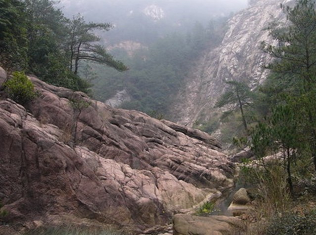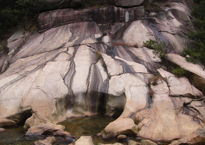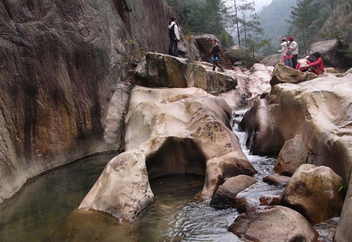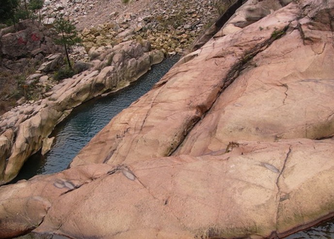 奇石群:數(shù)十塊10—50噸的巨石,經(jīng)過百萬年水的沖刷,表面紋理不一,有似魚鱗、浮雕、地圖等,其中有一塊酷似毛澤東的狂草手書。