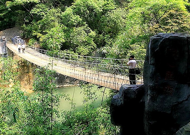 仙人橋位于縣城西南40余公里處的洛陽鎮(zhèn)半星雷屋村,高山斜坡上、綠樹掩映間,有大、小拱天然仙人橋兩座,屬石灰?guī)r溶蝕地貌景觀。大拱橋高70米,寬50米,長150米,小拱橋更為壯觀,高約138米,內(nèi)拱高106米,寬53米,長約156米,在大拱仙人橋的入口處,有峰巒延綿,勢如雄獅回首南望,獅身高約38米,長約60米,獅頭、獅眼因石灰?guī)r溶蝕脫落而成,形成了“雄獅回頭”的獨(dú)特景觀。