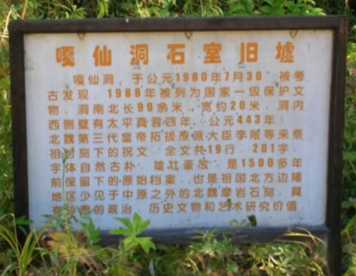 1980年7月30日,人們在嘎仙洞內(nèi)的斜陽中發(fā)現(xiàn)壁上刻有一些道痕,剝掉笞衣,才發(fā)現(xiàn)北魏第三代皇帝拓跋燾派中書侍郎李敞,當(dāng)年祭祖時所刻的祝文。石刻祝文開頭一行有“維太平真君四年癸未七月甘五日”(公元443年)字樣。祝文通篇是歌祖先之功德,乞神靈之賜福。