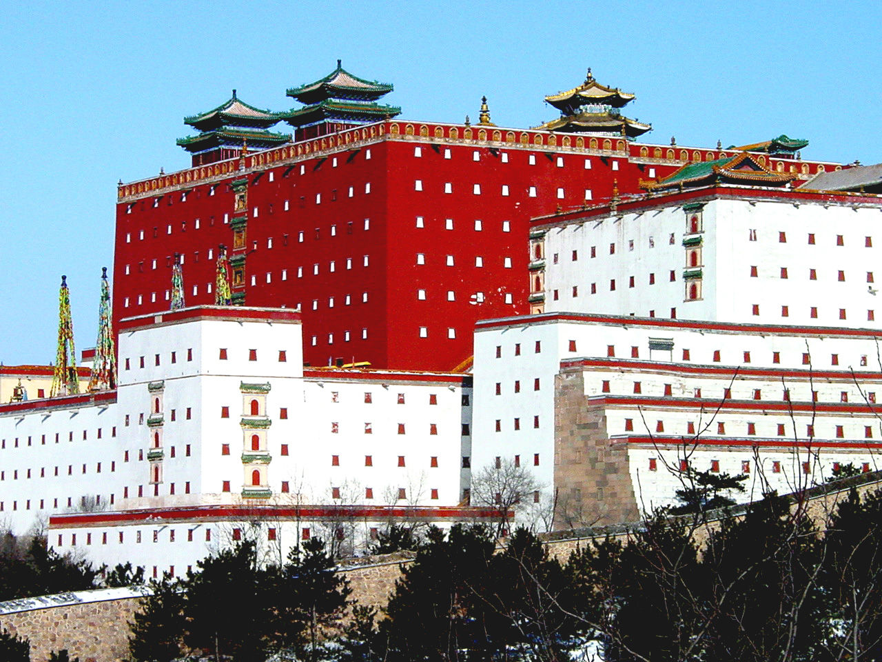 大紅臺南、第一部分兩側(cè)散置30余座大小白臺,成“×”形不規(guī)則布置。白臺分殿臺、樓臺、敞臺、實(shí)臺,形狀不一,體量不等,功能各異。層高一至四層,二、三層者居多,大都白灰抹面,青磚鑲邊紅色盲窗,琉璃砌頂,版權(quán)所有聊城聊之旅國際旅行社有限公司,轉(zhuǎn)載必究!上檐挑出淌水長瓦。白臺為藏式平頂?shù)锓啃沃?,建筑用漢族磚混結(jié)構(gòu)法式。有的兩座白臺組合成一處院落作僧房;有的臺上建漢式殿堂,作佛堂、鐘樓使用;有的臺頂置舍利塔;有的白臺砌成實(shí)心,只起障景增景及點(diǎn)綴作用。白臺群總體效果表現(xiàn)了西藏布達(dá)拉宮前山腳下梵字的特征。南部宮墻兩頭分置角樓,實(shí)墻白臺砌盲窗,頂部起雉堞。宮墻兩側(cè)白臺中間辟門,上起廡殿,對稱配置,供僧人進(jìn)出使用轉(zhuǎn)經(jīng)桶。