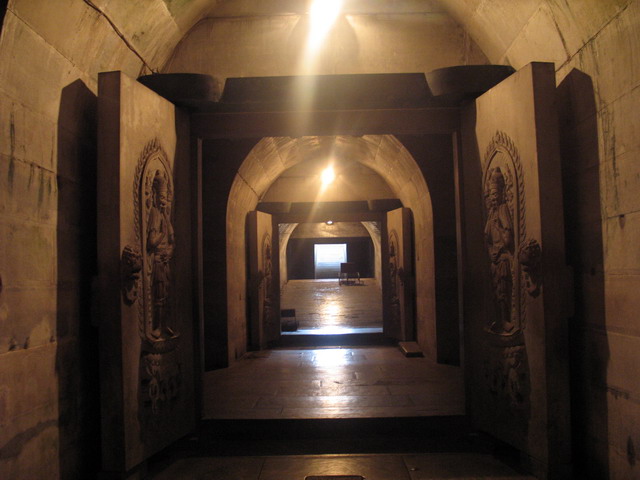 盡管清廷的遺臣為修建崇陵費(fèi)盡心思,光緒還是沒有能夠在他的地下寢宮里平安地長眠下去。1931年軍閥混戰(zhàn)時期,一伙不明身份的兵匪盜掘了崇陵地宮,多數(shù)隨葬品被劫走。1980年6月,經(jīng)上級批準(zhǔn),清西陵文物管理處開啟地宮,清理整修,供國內(nèi)外游客參觀。這座地宮墓道全長63.19米,是無梁無柱的石拱券式建筑,共有四道石門、九座券。門樓、門垛、門框、門簪均用青白石作原料,雕有瓦脊、瓦壟、花瓶等圖案,每道石門上都有巨大的銅鑄門管扇,八扇石門上分別雕有八大菩薩立像,金券內(nèi)有寶床,寶床正中有金井,光緒皇帝和隆裕皇后的棺槨停放在寶床上,棺槨周圍有用五彩繪制的龍山石16塊,寶床前東西各有石座兩個,座上有香箱,是存放“冊”、“寶”用的。這座地宮雖已被盜,但仍出土珠寶玉翠等文物數(shù)百件。