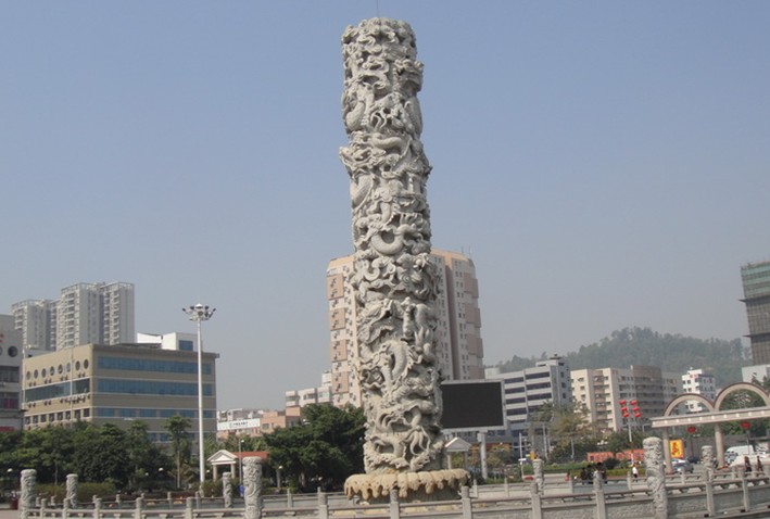 廣場分為三個區(qū)域:北端是集會區(qū),以半圓形主席臺為標(biāo)志,可舉行大型演出或舞會;中部是游覽區(qū),建有大型白色花崗巖石雕九龍柱,高19.99米、直徑3米、雕刻浮度為60厘米,總重量為260噸,配置噴水池直徑28米,水池周邊采用花崗巖“二龍戲珠”浮雕扶欄,欄間嵌有8條1.99米高小龍柱。噴水由里向外形成落差,分段迭灑,錯落有序。