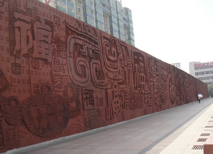 在廣場南側(cè)建有紫砂陶浮雕萬福壁,雙面長260米、高6米、作品厚度10-16厘米,紫砂作坯陰干、雕刻,經(jīng)1160攝氏度高溫?zé)贫伞9菜鸭酥袊鴼v代不同寫法的“福”字1萬余個,該作品經(jīng)中國美術(shù)學(xué)會雕塑專業(yè)委員會鑒定后于2000年4月收入大世界基尼斯之最。福字作為中國民間的傳統(tǒng)文化的元素,版權(quán)所有山東聊城聊之旅國際旅行社有限公司,轉(zhuǎn)載必究!有著數(shù)千年文明歷史,是人們對美好愿望無永遠追求和孜孜祈愿,《萬福壁》將其與千百年來民眾賴以棲身的中國式長墻結(jié)合在一起,體現(xiàn)了傳統(tǒng)藝術(shù)與中國民俗的高度統(tǒng)一。自萬福壁建成后引來眾多游人前往觸摸壁上各種寫法的福字以求沾染福氣。 萬福廣場始建于1978年,1979年收集完成,1980年完成