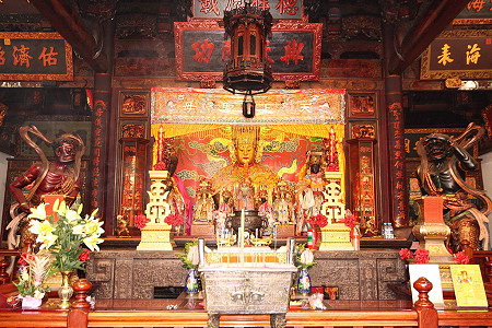 大天后宮為三進(jìn)門式。由大門朝里望,透過三進(jìn)逐次升高的天井和房舍狹長的空間,可以遙見那香煙繚繞、金黃帷幕下的全身媽祖神像。媽祖慈眉善目,神態(tài)安詳。據(jù)說媽祖原來是粉紅面,但經(jīng)百年來受香火的薰繞,現(xiàn)在看到的媽祖已成了黑色的“香煙面”了。兩旁配祀千里眼、順風(fēng)耳二將的泥雕,表情細(xì)膩,體態(tài)生動,古銅色的肌膚、一塊塊突起的肌肉,顯得極為兇猛威嚴(yán),雕刻精細(xì)入微,栩栩版權(quán)所有聊城聊之旅國際旅行社有限公司,轉(zhuǎn)載必究!如生,實(shí)為雕刻精品。兩邊的神龕里還供奉著東、西、南、北四海龍王和水仙尊王。神奇古怪,嶙峋不凡,也都被煙薰成了黑臉。這些都是與海上的航海、救難有關(guān)的神。該廟還有一個特色就是除了正殿的媽祖稱為大媽外,還配有所謂的“二媽”、“三媽”的媽祖神像,造型僅為大媽的一半,臉色為粉紅色,兩眼張開,與媽祖神像眼瞼呈下垂?fàn)畈煌?/p>