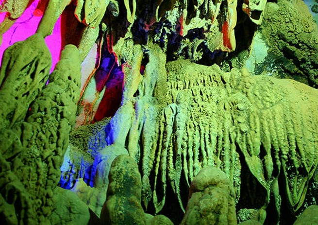 位于陽春市春灣景區(qū)內(nèi),巖洞全長1400米,龍泉溪水清澈,洞如長廊形,景物鬼斧神工、玲瓏剔透,有如龍宮之物。巖洞全程分四段:首段"迎賓廊","鐘乳寶塔"、"彩旗彩帶"招展,"石鼓"咚咚,"龍王水族"栩栩如生;次段是"龍王殿",兩側(cè)玉乳玲瓏,"龍宮浮雕"、"宮壁繡錦"惟妙惟肖;第三段為"聚寶庫",庫藏"鎮(zhèn)宮寶塔"、"定海神針"、"金玉龍床";第四段為"龍舟",其間石筍石幔琳瑯滿目。