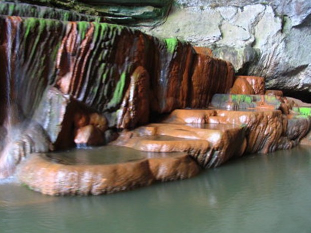 陽(yáng)春玉溪三洞全長(zhǎng)3公里,均可坐船瀏覽。第二洞長(zhǎng)330米,水深2-5米,水面寬20-30米,河水清澈如玉,水中多生長(zhǎng)鯉魚(yú)。洞中景物豐富,尤以“三變石”為趣,詩(shī)人張永枚曰:“遠(yuǎn)似漁翁釣清流, 近如獅子滾繡球,忽變犀牛望明月,一石三景迷輕舟”。第一洞頂?shù)?ldquo;皇冠”石,酷似皇冠,游人在船上隨即可拍攝一幅頭戴皇冠的照片。第一洞長(zhǎng)400米,上面有一層旱洞,水面距洞頂高48米,該洞以“金盞疊泉”最為壯觀,一個(gè)個(gè)金黃色的石盞滿載清澈的泉水往下流。詩(shī)人韋丘贊道:“串玉溪穿三洞天,柔情碧水石能言,聲聲燕語(yǔ)留歸客,舉漿猶疑落漿難”。