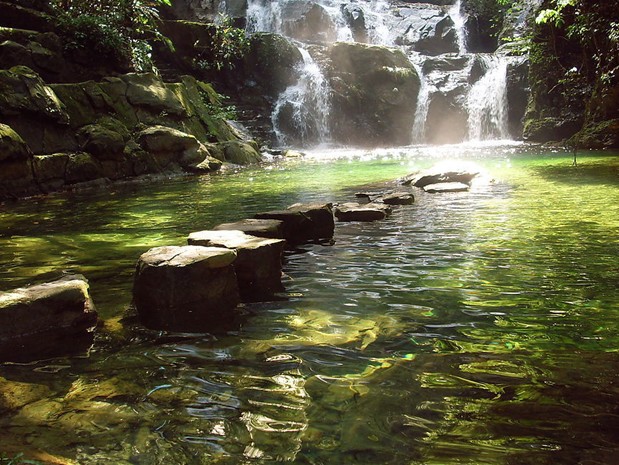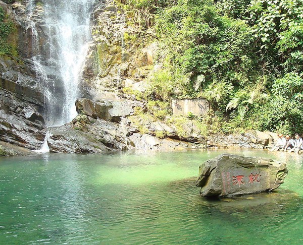 鼎湖山飛水潭,又名龍?zhí)讹w瀑,位于鼎湖山南半山腰、慶云古剎下東側(cè)。 去飛水潭,由榮睿碑亭拾級登山,沿曲徑云封直上,至半山腰向右拐,過眠綠亭即可。當然,亦可在榮壑碑亭前面的山溪邊起步,一直溯溪而上。這里,山石嶙峋,瀑布從40多米高的崖頂深處狂奔而來,直往下飛瀉,忽而形成千尺飛流,如白練懸空,忽而濺作滿空雨花,如輕紗曼舞。瀑布下,如注的水流匯成一泓碧水,中有巨石,上刻“枕流”2字。辛亥革命后,孫中山先生偕夫人宋慶齡游覽鼎湖山時,曾在此游泳,現(xiàn)崖壁上刻有宋慶齡手書的“孫中山游泳處”6個大字。潭水由此再往下傾瀉,版權(quán)所有山東聊城聊之旅國際旅行社有限公司,轉(zhuǎn)載必究!繼而形成另一個深潭,據(jù)傳為蟄龍窟,故曰:浴龍池。飛水潭側(cè)建有更衣室,崖間建有觀瀑亭,崖壁鐫刻著許多贊美飛水潭的摩崖大字和方寸小楷,如“噴雪”、“能移我情”、“天然圖畫”、“飛泉咽危石”等,頗有詩情畫意。 夏日到此,觀瀑、游泳、濯足,均感遍體清涼,煩熱頓消。