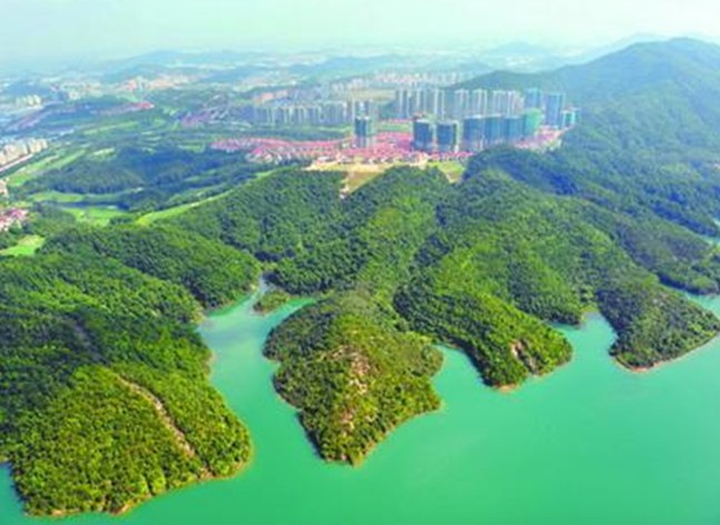 長江疊翠是中山市新十景之一,指的是長江水庫游覽區(qū),這里離中山城區(qū)中心石岐東南九公里,是建設(shè)在著名抗日游擊根據(jù)地五桂山區(qū)北面的以水庫為中心的游覽區(qū)。水庫1963年基本建成,它包括里面相連的6條大水坑,7處山梁山埔和一道攔庫大壩,集水面積三十六 平方公里,庫容達五千萬立萬。雄偉的水庫大壩頂面寬6米多,長330米。往水庫區(qū)里望, 莽莽群山,重巒疊嶂,一望無限的松林,郁郁蔥蔥,還有杉樹、樟樹、苦楝…等和許多叫不出名字的樹木。一派生機,濃綠如絨如砌,倒映湖中,就是這里美景"疊翠"風(fēng)韻之所在。