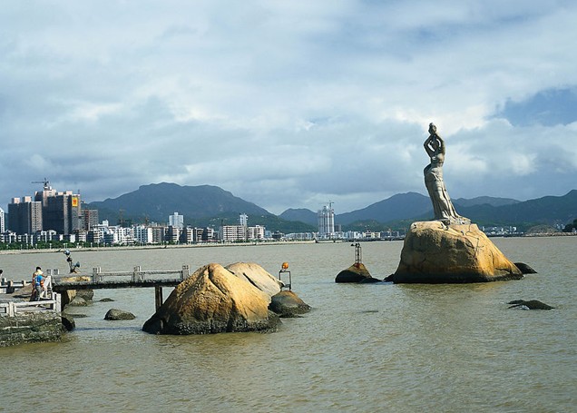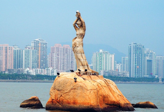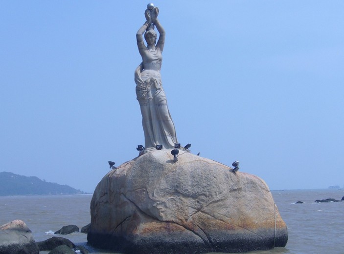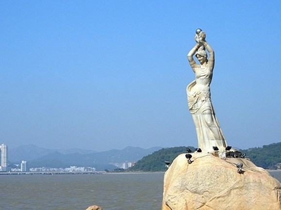 珠海市風景秀麗的香爐灣畔,矗立著一尊巨型石雕——珠海漁女,一條美麗整潔的環(huán)海大道——情侶路從她身旁穿過,更使她顯得純潔而大方。她領戴項珠,身掮魚網(wǎng),褲腳輕挽,帶著喜悅而又含羞的神情雙手高高擎舉著一顆晶瑩璀璨的珍珠,獻給德高望重的九洲長老,并向世界昭示著光明,向人類奉獻珍寶。